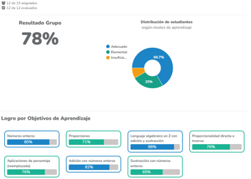Se obtiene información detallada sobre el nivel del "grupo" y de cada "estudiante" sin necesidad de realizar pruebas extensas, facilitando la toma de decisiones pedagógicas.