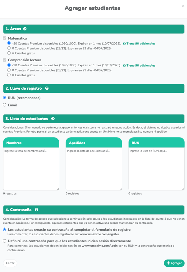 Si no quedan cuentas premium, igual puedes crear los usuarios y luego pedir al equipo directivo que contacte al equipo de servicio de Umáximo.