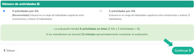 Luego de seleccionar todos los bloques de contenido, en la parte inferior, debes indicar el número de actividades que el sistema asignará por cada uno. Hay dos opciones: 2 o 3. Luego haz clic en “Continuar” para avanzar con la configuración.
