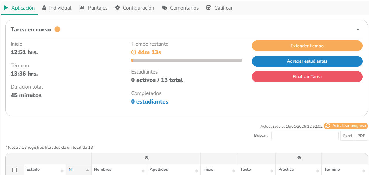 Una vez asignada la tarea, serás redirigido automáticamente a las pestañas de monitoreo y configuración de la tarea.