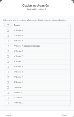 Selecciona el o los grupos donde quieres copiar la evaluación y luego haz clic en “Copiar”.