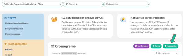 Haz clic en el botón “+Evaluación” (verde), que se encuentra al costado derecho del cronograma.