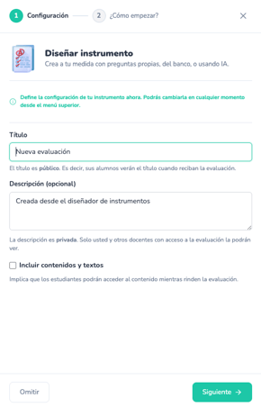 Asigna un nombre a la evaluación en el campo "Título", agrega una descripción opcional y decide si marcarás la casilla "Incluir contenidos y textos" para que los estudiantes revisen material de estudio antes de responder. Esto es útil si deseas generar una guía de trabajo con contenido y actividades. Haz clic en "Siguiente".