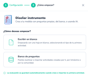Selecciona la opción "Banco de preguntas" para utilizar las actividades de la plataforma, o "Escribir en blanco" si prefieres comenzar desde cero. Si seleccionas "Escribir en blanco", más tarde también podrás agregar preguntas desde el banco de actividades de Umáximo.