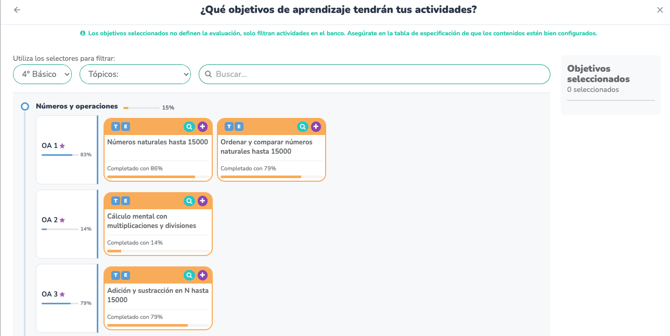 Haz clic en el ícono "+" (morado) sobre cada contenido u objetivo que desees incluir en la evaluación. Haz clic en "Continuar".