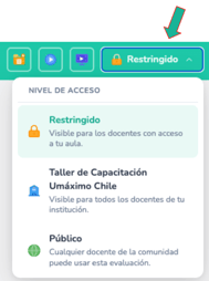 También puedes modificar esta opción para compartirla con los docentes de tu "Institución" o hacerla "Pública" para toda la comunidad Umáximo. Esto significa que otros docentes podrán ver tu evaluación para usarla con sus estudiantes.