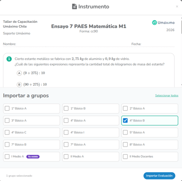Verás que ya estará marcado el "grupo" desde el que iniciaste la creación. Puedes seleccionar otros grupos si deseas importarla a más de uno. Confirma haciendo clic en el botón azul "Importar Evaluación".