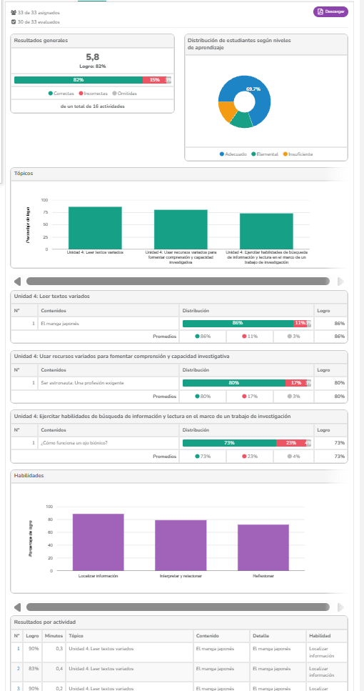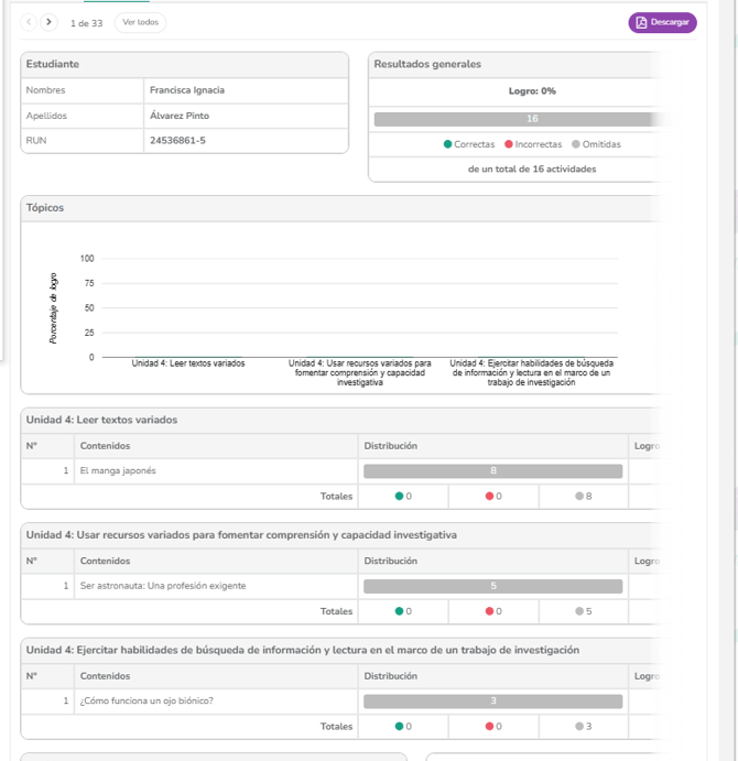 Puedes descargar esta tabla en Excel o PDF. Haz clic sobre el nombre de un estudiante para ver su informe individual completo, también puedes descargar este informe en "PDF".