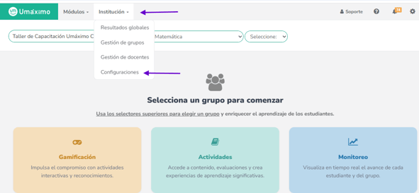 En la plataforma, haz clic en el botón “INSTITUCIÓN”, ubicado en la parte superior izquierda. Luego selecciona la opción “Configuraciones”.
