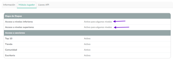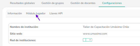 Haz clic en la pestaña “Módulo jugador” para ver las opciones relacionadas con el acceso de los estudiantes.