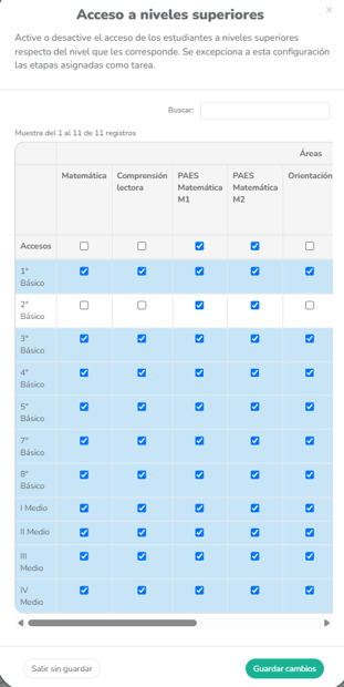 Selecciona los niveles y áreas donde deseas restringir el acceso al mapa de etapas. Desmarca aquellos niveles y áreas donde decidieron que los estudiantes no tengan acceso a todo el mapa de etapas.