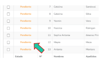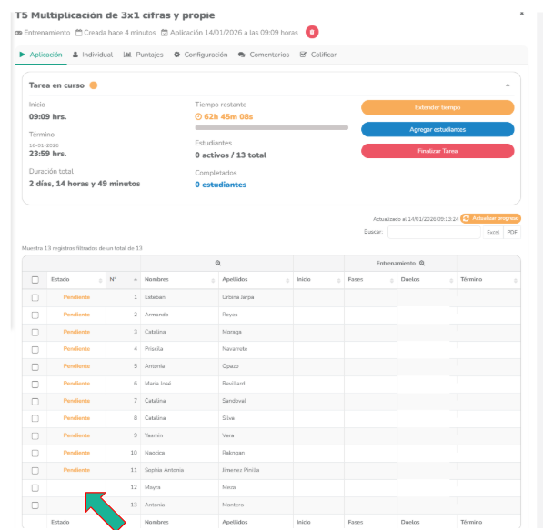 Al abrir la tarea, verás el listado de los estudiantes que ya la tienen asignada. Estos aparecerán inicialmente con el estado "Pendiente". Aquellos que no fueron seleccionados originalmente aparecerán en blanco o sin estado asignado.