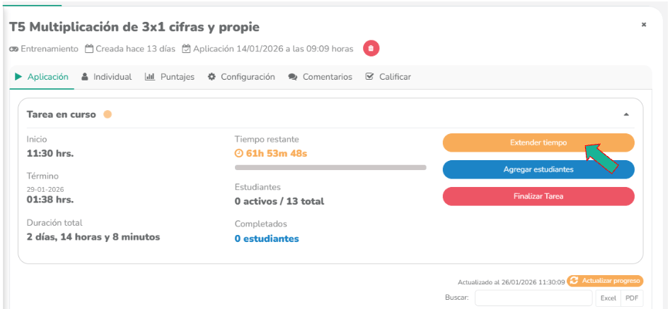 Si el estudiante que agregaste necesita más tiempo para completar la actividad, puedes ajustar la fecha de término. El progreso de los estudiantes que ya estaban trabajando en la tarea no se verá afectado por esta acción.