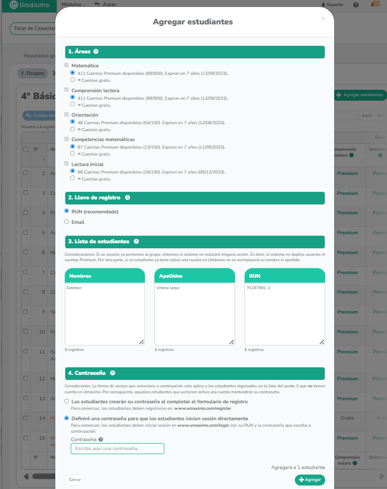 - Haz click en “+Agregar estudiante” (verde)
