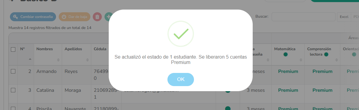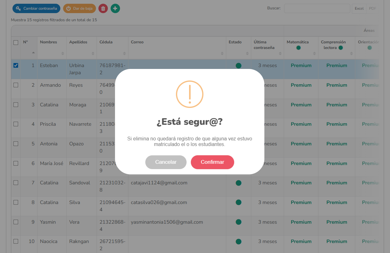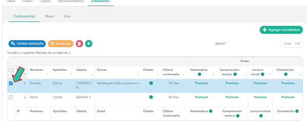 Accederás a la vista con el listado de estudiantes. Selecciona la casilla a la izquierda del nombre del estudiante que deseas cambiar. Se habilitarán los botones de acción en la parte superior.