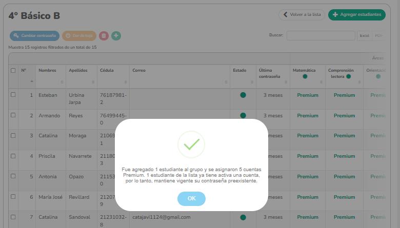 Selecciona el nuevo grupo donde agregarás al alumno. Vuelve a la sección “Estudiante” y accede al botón “Contraseña”.