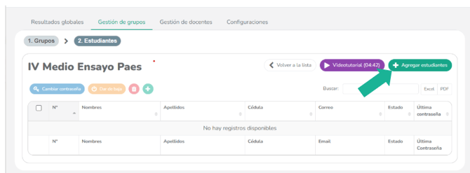 Al acceder, selecciona el botón verde “Agregar estudiantes” e ingresa los datos de los estudiantes con los que trabajaras en este grupo.