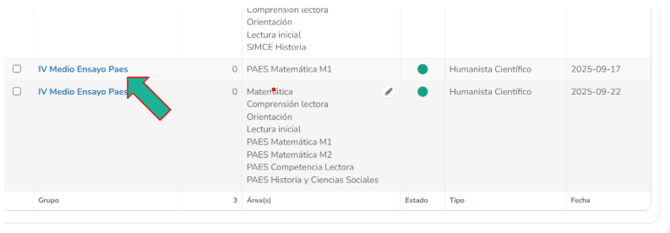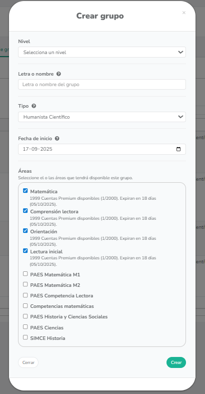 Selecciona un Nivel y si por ejemplo quieres crear un grupo para evaluación Paes, en letra o nombre indica “Ensayo Paes" luego selecciona asignatura.