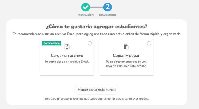 Al iniciar la configuración de tu institución, tendrás dos opciones para ingresar los datos: cargar un archivo Excel o copiar y pegar la información directamente. Te recomendamos utilizar "Cargar un archivo". Para esto debes hacer clic en esa opción.