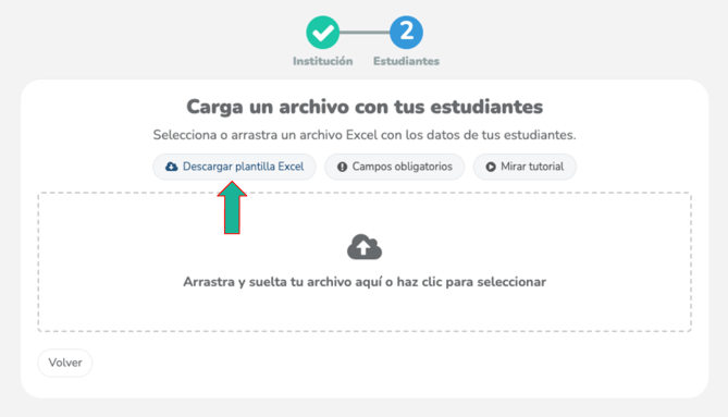 Si hay un error en el archivo, podrás seleccionar la opción "Volver" para borrarlo y subir uno nuevo.