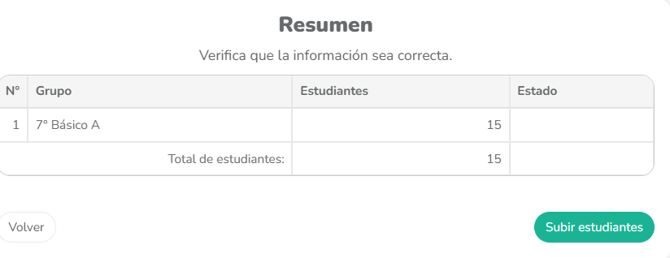 El sistema te presentará un resumen con la cantidad de grupos y estudiantes identificados. Haz clic en "Subir estudiantes" para procesar la información.