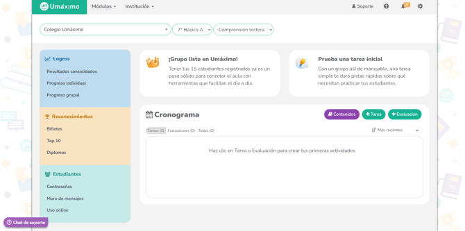 Tras completar la carga, serás redirigido automáticamente a tu pantalla de inicio, donde tendrás acceso a todas las herramientas de gestión para comenzar a trabajar con tus nuevos grupos.