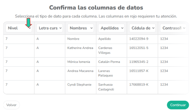 Una vez cargado, el sistema analizará la información y te mostrará una vista previa. Utiliza los selectores superiores para clasificar o descartar las columnas según corresponda (nombres, apellidos, grupo, nivel, letra, Cédula de identidad, contraseña). En este paso puedes "omitir" alguna columna con datos que no apliquen, por ejemplo las columnas opcionales.