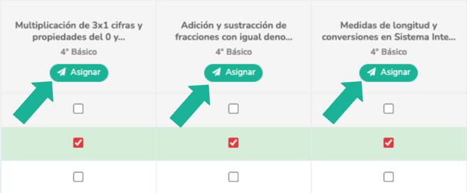 En cada columna, asociada a un tema, verás el botón “Asignar”. Al seleccionarlo iniciarás el proceso de creación de una tarea (sobre este) para cada estudiante seleccionado en dicha columna.