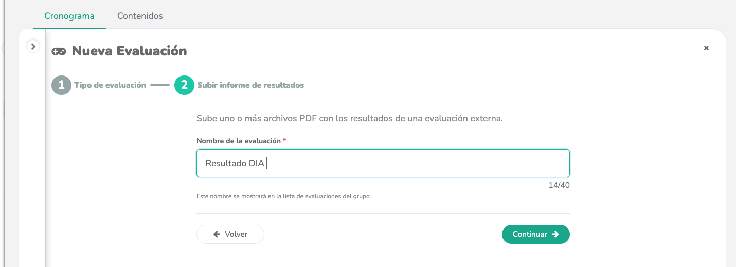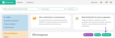 Haz clic en el botón “+Evaluación” (verde), que se encuentra al costado derecho del cronograma.