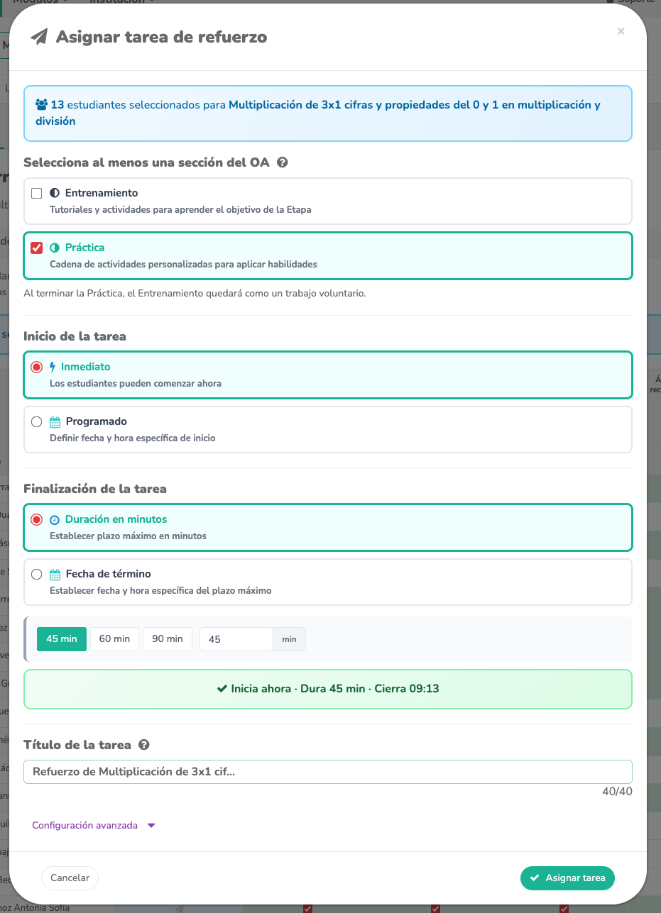 🛎️ La configuración y aplicación de estas tareas de reforzamiento se ejecuta de la misma forma que en el proceso de asignar tareas desde el cronograma.
