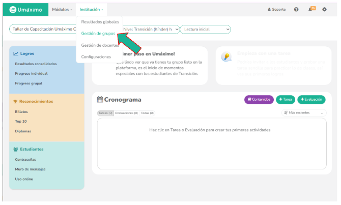 Dirígete a la pestaña "Institución" en el menú superior y selecciona la opción "Gestión de grupo".