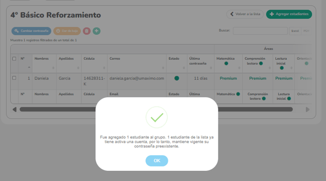 Aparecerá una ventana de confirmación indicando que los estudiantes han sido incorporados al grupo. Si el estudiante ya cuenta con una cuenta activa en la plataforma, el sistema mantiene su contraseña vigente y su historial de aprendizaje.