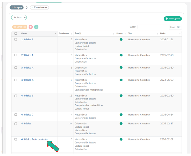 ✅¡Listo! Ya creaste un grupo de reforzamiento para trabajar con los estudiantes. Ahora aparecerá en el menú superior dentro del listado de grupos.