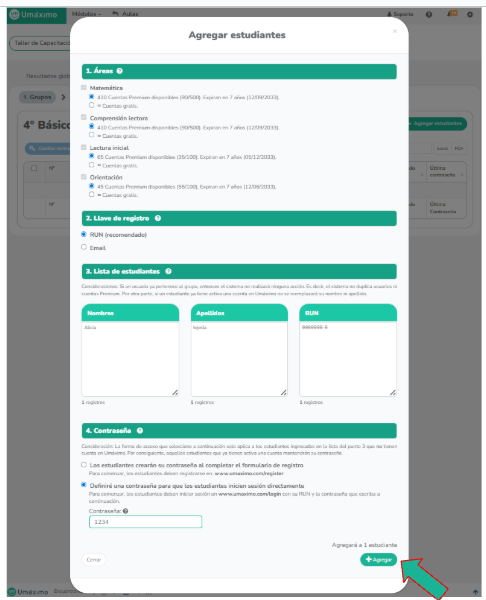 En la ventana emergente, completa los datos de identificación del cada estudiante. Se sugiere definir una contraseña en este paso para que las cuentas queden habilitadas de inmediato. Finalmente, haz clic en "Agregar".