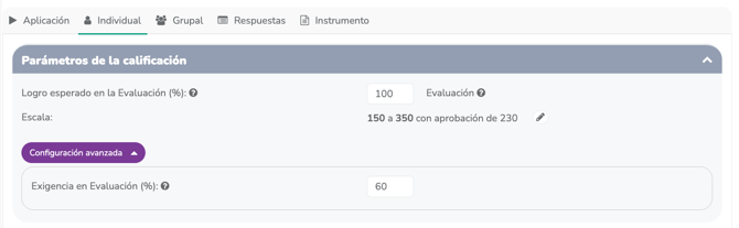 La plataforma viene configurada con un logro esperado del 100% y una exigencia del 60%. Sin embargo, puedes modificar estos parámetros desde la pestaña "calificar" de cada evaluación para ajustarlos a las necesidades de tu grupo. Acá te compartimos un tutorial para saber cómo hacerlo: Enlace >