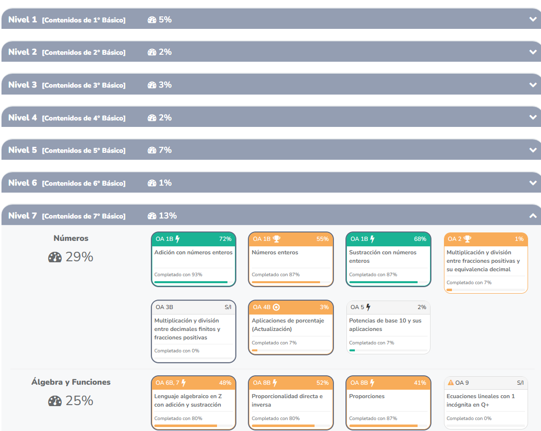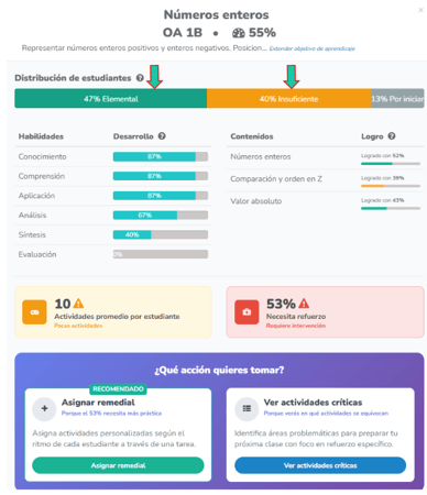 El progreso grupal permite identificar el aprendizaje consolidado de tu grupo, detallado por habilidades y contenidos, ofreciendo sugerencias de tareas remediales para fortalecer el desempeño académico en tiempo real.