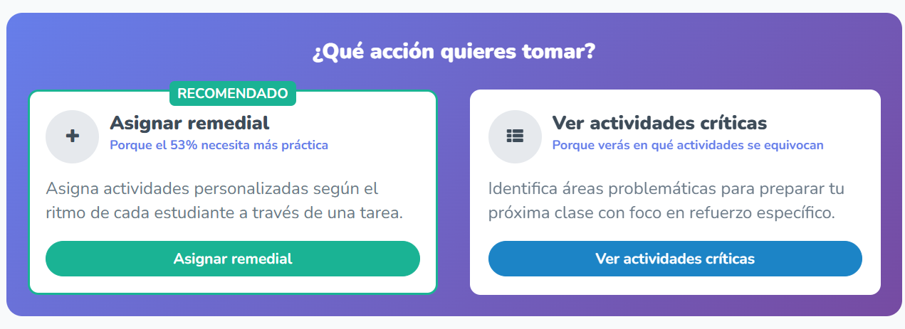 Utiliza estos datos para identificar "Actividades críticas" y tomar decisiones pedagógicas inmediatas para apoyar a los estudiantes que presentan mayores dificultades.
