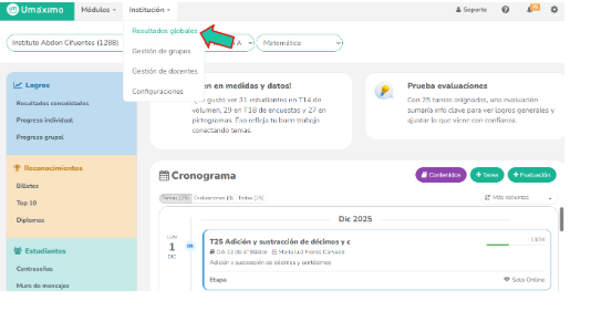 En la parte superior de la página principal, haz clic en el botón "Institución" y selecciona la opción "Resultados globales".