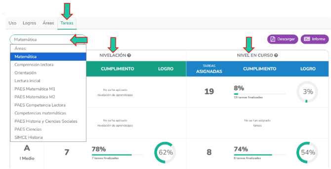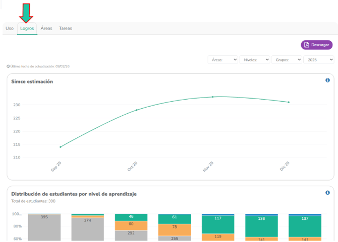 En las pestañas de “Uso”, "Logros", "Áreas" y "Tareas", puedes documentar la información haciendo clic en el botón morado "Descargar" para obtener un PDF.