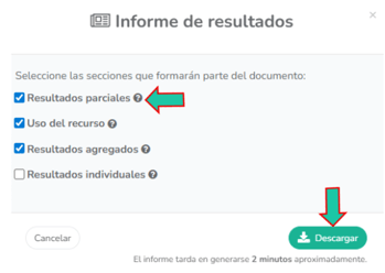 Se abrirá en pantalla la configuración, donde podrás seleccionar qué secciones formarán parte del documento y descargarlo en formato PDF. En ícono de pregunta leerás una explicación de la sección antes de descargar.