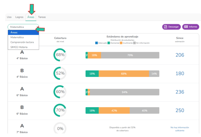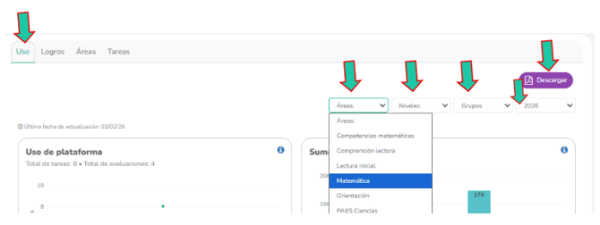 Al igual que en la sección anterior, puedes filtrar la información según tus necesidades pedagógicas, "Áreas", "Niveles", "Grupos" y “Año”.