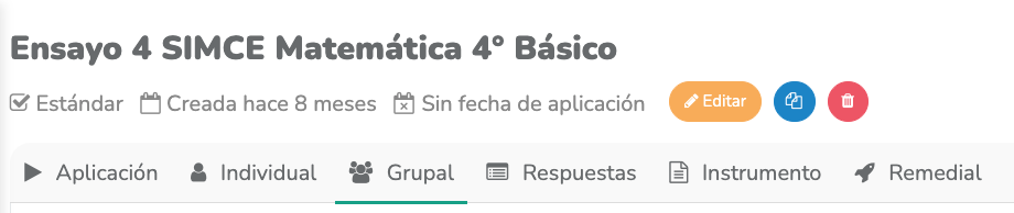 En las pestañas "Grupal" e "Individual" puedes ver los reportes de resultados con información organizada por tema curricular evaluado.