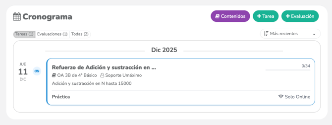 🛎️ La configuración y aplicación de estas tareas y evaluaciones se ejecuta de la misma forma que en el proceso de asignar tareas o evaluaciones desde el cronograma.