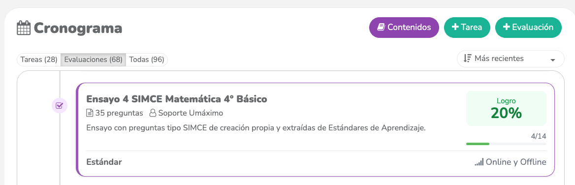 En el cronograma, haz clic en la evaluación que cuente con resultados (respuestas de los estudiantes) para la que deseas ver la ruta de reforzamiento.