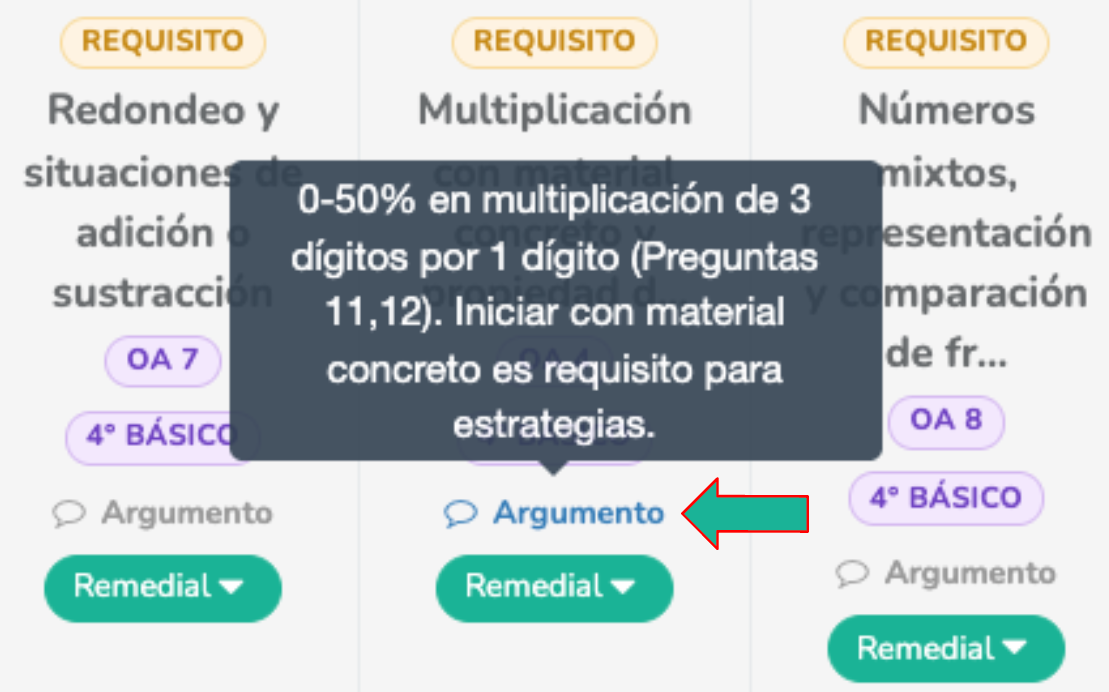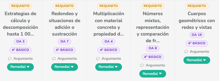 En la tabla de resultados, el sistema sugerirá actividades de reforzamientos específicos para cada estudiante. Estas se clasifican mediante etiquetas para guiar tu decisión pedagógica: